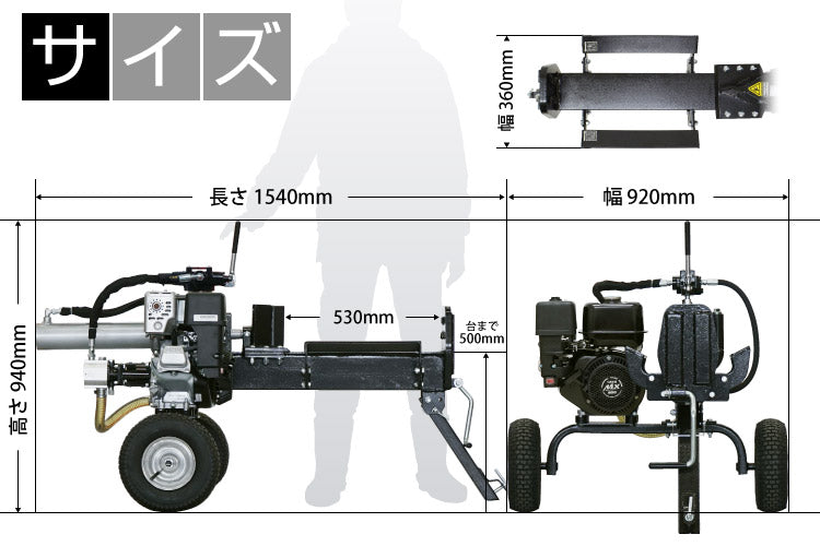 PLOWエンジン薪割り機において最軽量104kg。そのコンパクトサイズで破砕力12トン、サイクルタイム9秒を実現させた。立った状態で操作できるコントロールレバー、コンパクト機では珍しいウェッジが動く仕様など、スペックだけでなく作業性能も良好。コストパフォーマンスに優れ、家庭用として、入門機としても最適な1台。