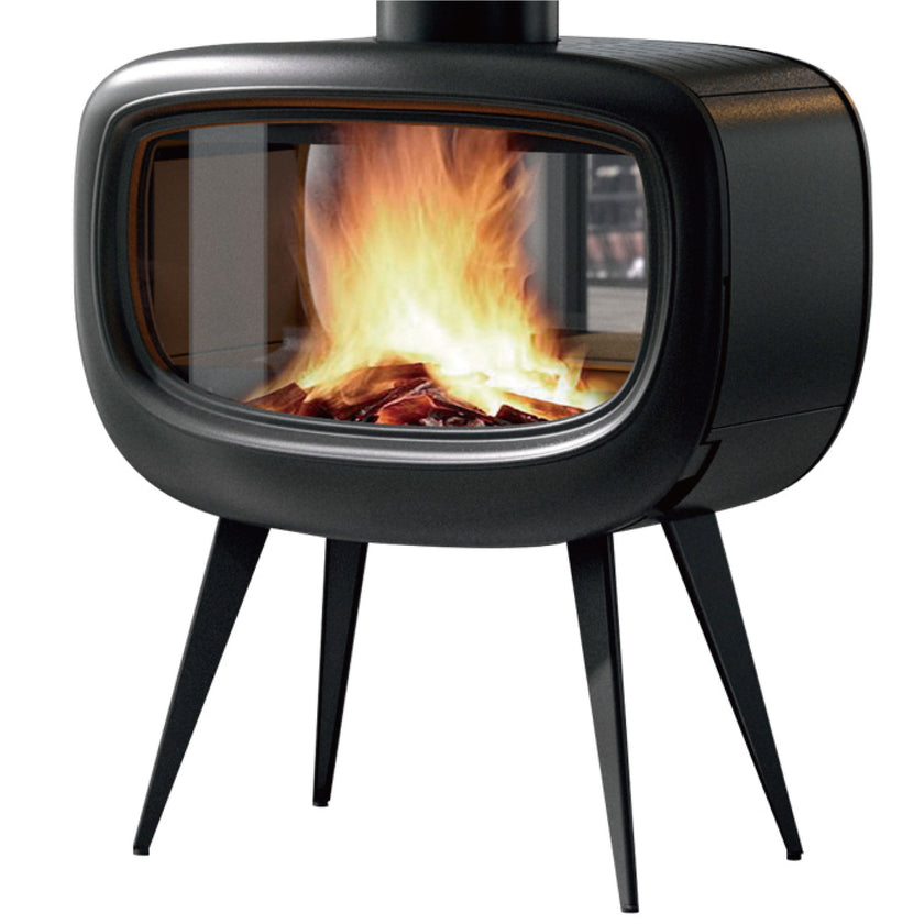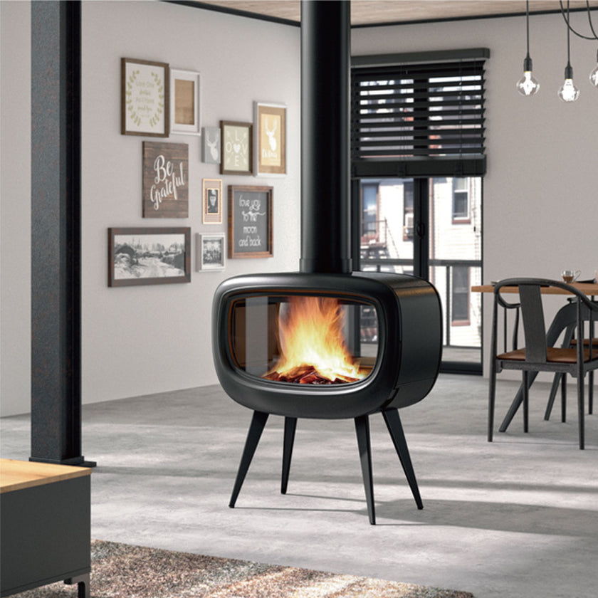 薪ストーブは壁に沿って置いてあるイメージがありますが、ゴダンのバゲラDFは前面からも背面からも火が見えるのでお部屋の真ん中で火を主役にすることができます。