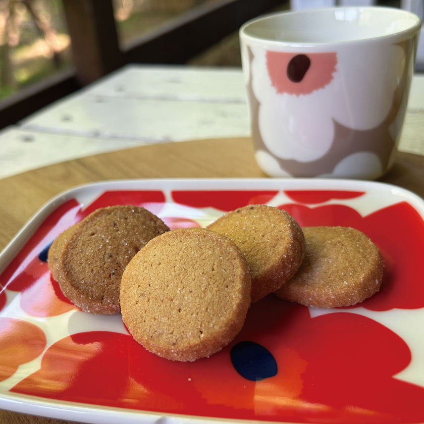 フィンランドの森だけで購入できるオリジナルクッキーでクッキーには「イヌリン」(発酵する植物繊維)が使われています。「イヌリン」はおなかの調子を整えてくれることはもちろん、食後の血糖値上昇を穏やかにすることが報告されています。また、健康を考え、なるべく砂糖を少なくし、甘みのある「イヌリン」で代替えしています。