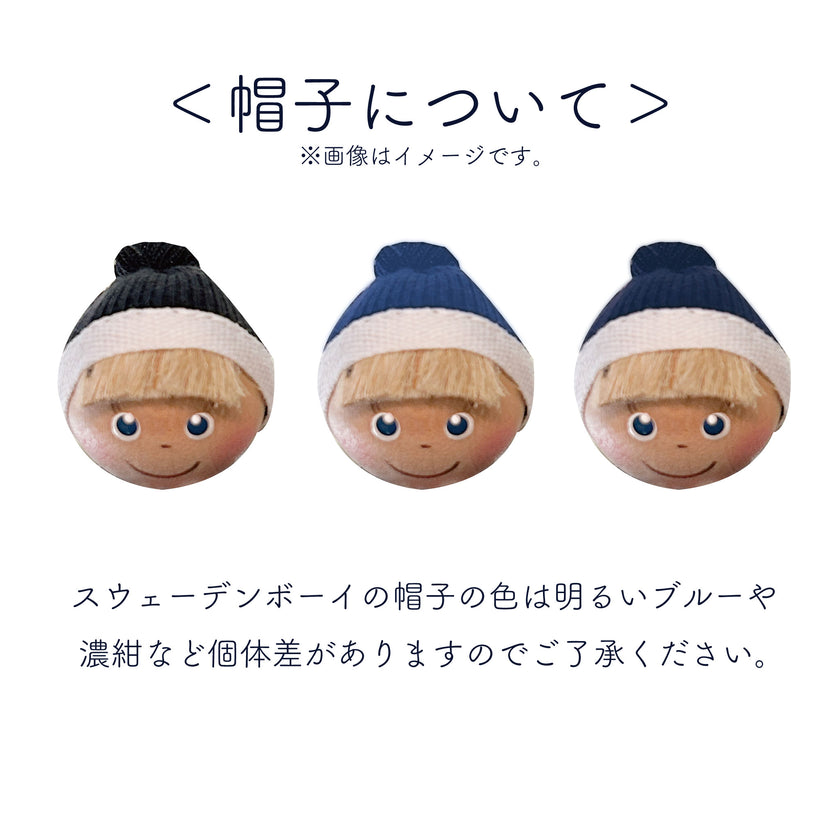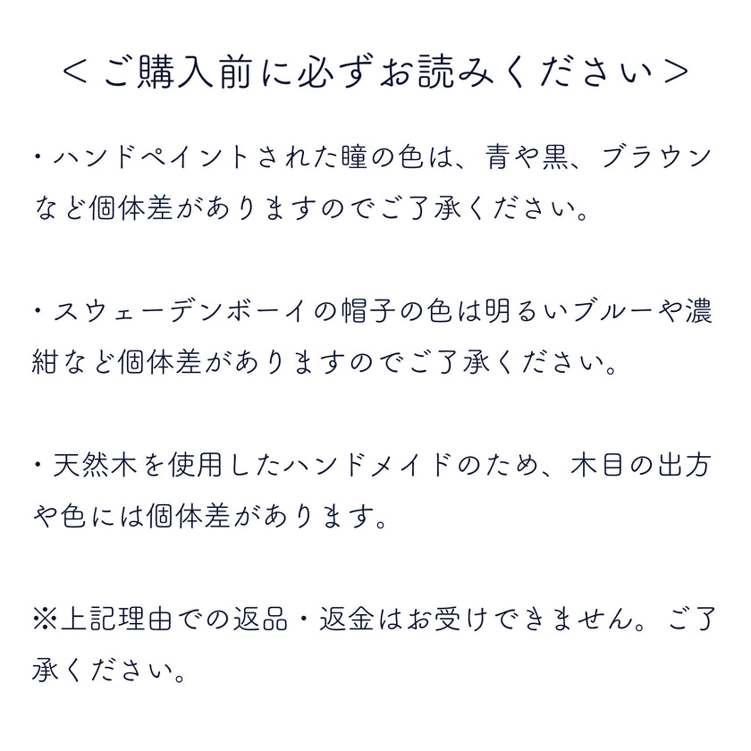 ハンドペイントされた瞳の色は、青や黒、ブラウンなど個体差がありますのでご了承ください。スウェーデンボーイの帽子の色は明るいブルーや濃紺など個体差がありますのでご了承ください。天然木を使用したハンドメイドのため、木目の出方や色には個体差があります。